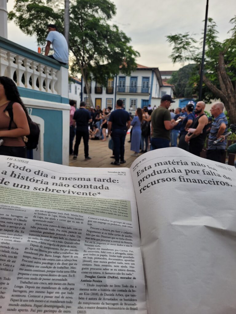 Em meio ao silêncio, o alerta que nunca foi acionado no dia do rompimento, entoou e pulsou no coração do Centro Histórico de Mariana, nesta quarta-feira (5/11). Uma década depois, a voz dos atingidos e atingidas tenta dar vazão ao sentimento de resistência e de justiça, diante da angústia do silêncio das autoridades e em protesto pela lentidão dos processos de reparação.