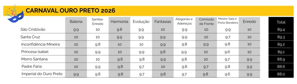 Com 89.4, a Acadêmicos do São Cristóvão conquistou o 10º título, consolidando-se como uma das escolas mais vitoriosas do Carnaval de Ouro Preto.