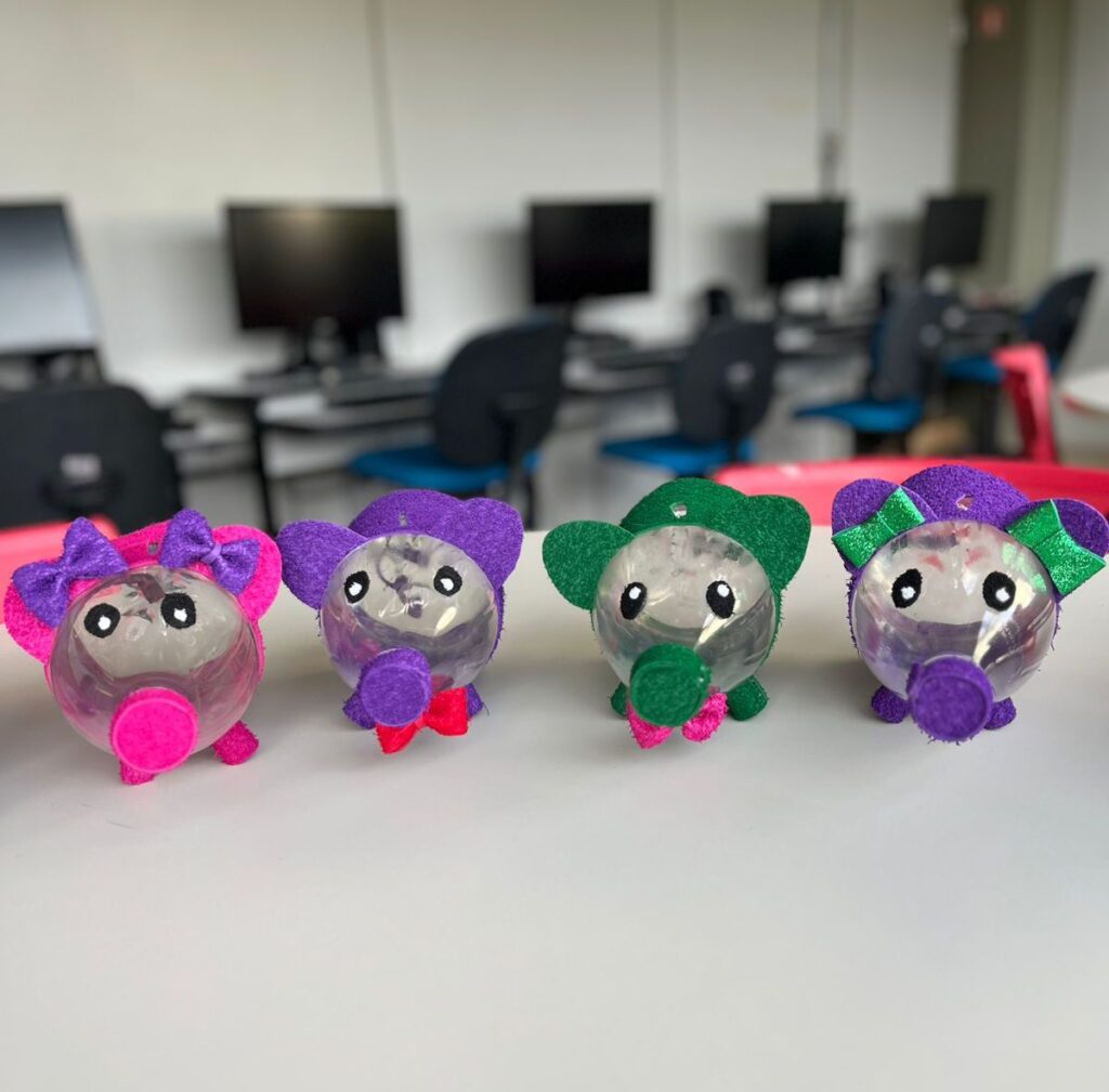 Com o apoio dos educadores e da cooperativa, os alunos confeccionaram 89 cofrinhos em formato de porquinho, feitos a partir de garrafas PET, e os entregaram como presente às crianças, acompanhados de uma história sobre poupança e responsabilidade financeira.