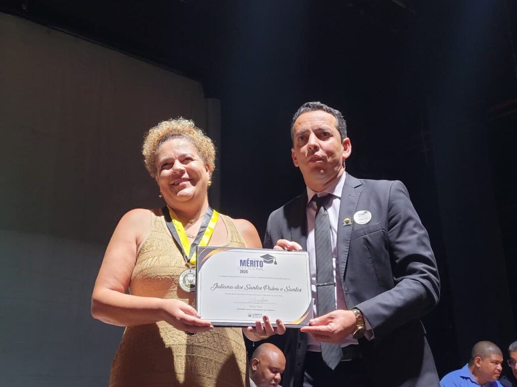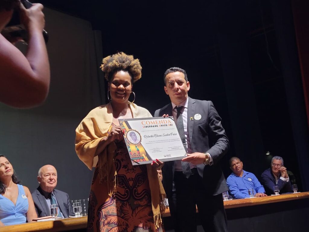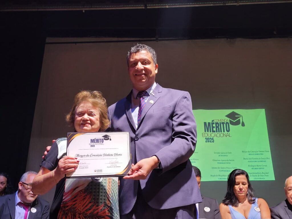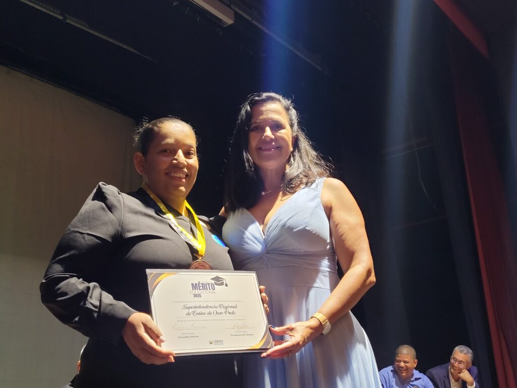 A representante da Superintendência Regional de Ensino de Ouro Preto, Regiane Teixeira Marcos, foi a oradora oficial dos homenageados desta seção. “Não é somente sobre uma pessoa ou uma entidade, é sobre a potência transformadora da educação pública, de qualidade, que ofertamos no município de Ouro Preto, e sobre todos que caminham conosco. Com profunda emoção e responsabilidade, recebemos essa homenagem”, reiterou.