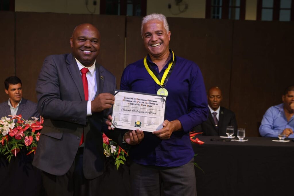 Na noite desta quarta-feira (10), a Câmara Municipal de Ouro Preto realizou uma cerimônia de entrega das honrarias João Velloso e Honra aos Veteranos Militares e de Forças Auxiliares. A solenidade reuniu vereadores, cidadãos e representantes de entidades de proteção cultural e natural, profissionais das forças de segurança, familiares e convidados em um momento de reconhecimento à dedicação e ao compromisso daqueles que fazem de Ouro Preto sua missão de vida.